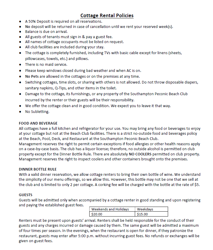 When completing and signing the online form, you understand that any outstanding cottage and restaurant balances will be charged to the card on file, and you must contact the Southampton Peconic Beach Club to make any updates to credit card information.